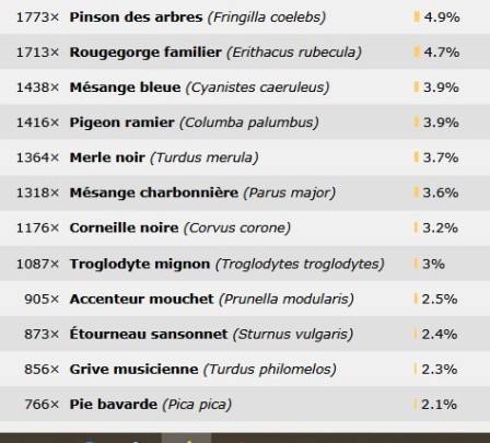 Les 12 premières espèces représentent à elles seules plus de 40% des données collectées dans le mois. 7 espèces se partagent les 6 premières places depuis 2021, le rougegorge familier, le merle noir, le pinson des arbres, la mésange charbonnière, la mésange bleue, le pigeon ramier et le moineau domestique (une seule année). Toujours en considérant les 6 premières espèces pour les 6 années de 2021 à 2026 et en donnant un score de 6 points au premier, 5 au deuxième, 4 au troisième, le rougegorge arrive devant le pinson et le merle.
