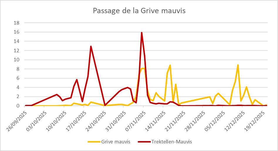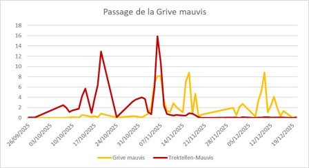 Quant au pic de Mauvis du 8-10 décembre, il est introuvable sur Trektellen, où les plus gros effectifs sont contactés… sur des sites français généralement situés plus au sud. Il s’agit vraisemblablement d’un mouvement de faible ampleur géographique, voire purement local et difficile à expliquer, d’autant qu’on ne relève aucun événement météo à cette période où la température est uniformément douce.