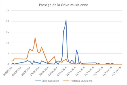 La migration de la Grive musicienne selon Trektellen présente un pic massif dans la deuxième décade d’octobre, qui voit passer près des deux tiers des oiseaux contactés : ce pic ne laisse aucune trace dans les relevés de Coutances. Réciproquement, le pic local du 5-7 novembre qui voit passer plus de la moitié des Musiciennes coutançaises correspond à peine à un frémissement dans les données Trektellen, principalement composées d’oiseaux notés dans divers sites de la moitié nord de la France, et des Pays-Bas. En revanche, comme on le verra plus loin, ce pic de Musiciennes à Coutances se produit exactement à la date d’un pic de Grives mauvis noté à Coutances et sur Trektellen, comme si, localement, les Musiciennes avaient été « entraînées » par leurs collègues !