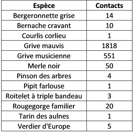 Le tableau suivant donne la liste des espèces contactées en migration et les effectifs retenus. Dans le cas des espèces à la fois présentes sur place et contactées en passage nocturne (Merle noir, Rougegorge familier), ce tableau ne retient que les données correspondant à des cris de vol. Une exception : la Bergeronnette grise qui stationne dans la ville et passe aussi en fin de nuit, pour laquelle il est impossible de trancher.