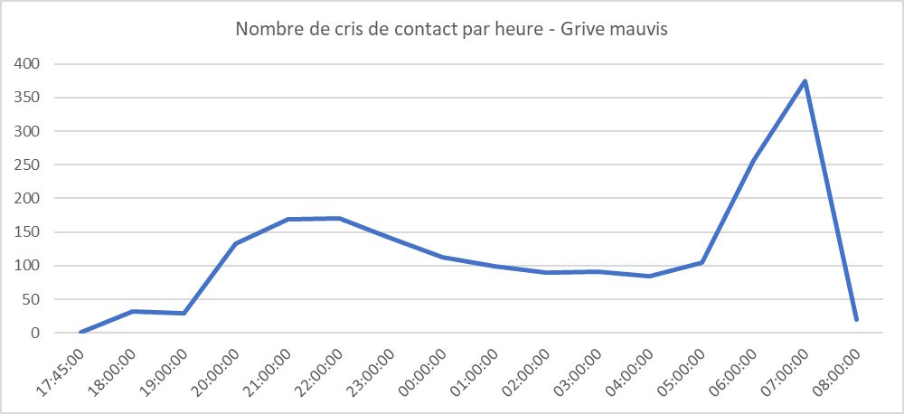 Le cas du pic de mi-novembre, d’ailleurs plus modeste, est différent : il est à peine visible sur les bilans journaliers Trektellen. Toutefois, à ces dates, on constate nettement que les sites ayant compté le plus grand nombre de Mauvis sont situés en Belgique ou sur les côtes du nord de la France (Nord, Pas de Calais, Somme). Dans ce cas, il est extrêmement probable que les oiseaux entendus à Coutances soient passés là la nuit même. Sur ces deux nuits du 15 et du 16 novembre, les effectifs de début, milieu et fin de nuit sont semblables.