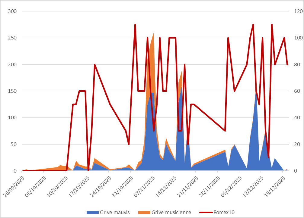 Au moins cet automne, seul le passage de grives mérite une sorte d’analyse. Les autres espèces sont présentes en effectifs quasiment anecdotiques.