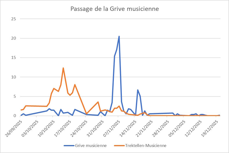 Pour cette espèce, on observe, cette fois, des ressemblances un peu plus sensibles avec le schéma européen visible sur Trektellen, avec des différences notables tout de même. Plus exactement, il y a un événement concomitant, mais non des moindres : c’est le principal pic de passage de l’espèce, qui cette fois-ci a été bien sensible à Coutances. Comme évoqué plus haut, ce pic du 5-7 novembre se redouble dans la Manche d’un rush de Grives musiciennes comme s’il y avait eu entraînement ou aspiration.