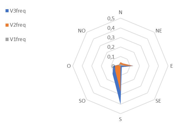 Du côté de la météo, la rose des vents présente l'allure ci-après : les 3 tranches de vitesse étant 0-4 km/h, 4-8 et 8-12, la vitesse maximale relevée étant de 12 km/h (on retient la valeur principale et non la valeur en rafales). Les vents de sud sont fortement prédominants (sud 40% ; sud-ouest 11%).