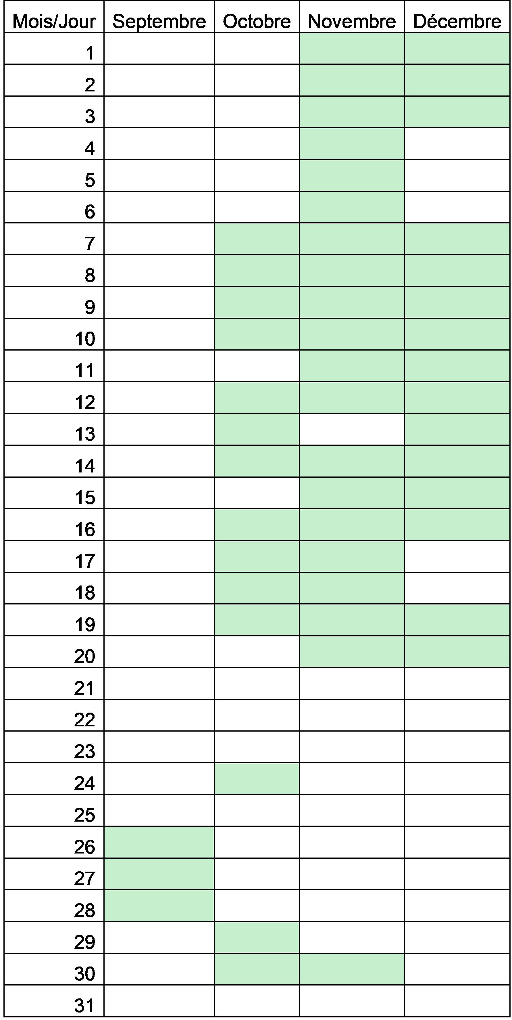L’enregistreur est paramétré pour couvrir la période allant du crépuscule civil à l’aube civile, afin de se mettre en conformité avec le protocole "Vol de nuit" (collaboration MNHN, Biophonia et LPO). Seules les nuits annoncées comme très pluvieuses ou très venteuses sont évitées, pour la simple raison que les cris sont alors indétectables. Concrètement, l’enregistreur a fonctionné aux dates correspondant, ci-dessous, aux cases vertes.