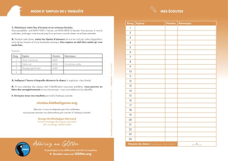- Enfin, envoyez-nous vos observations par mail à <nicolas.klatka@gonm.org> ou par courrier à Groupe Ornithologique Normand, 181 rue d'Auge 14000 Caen